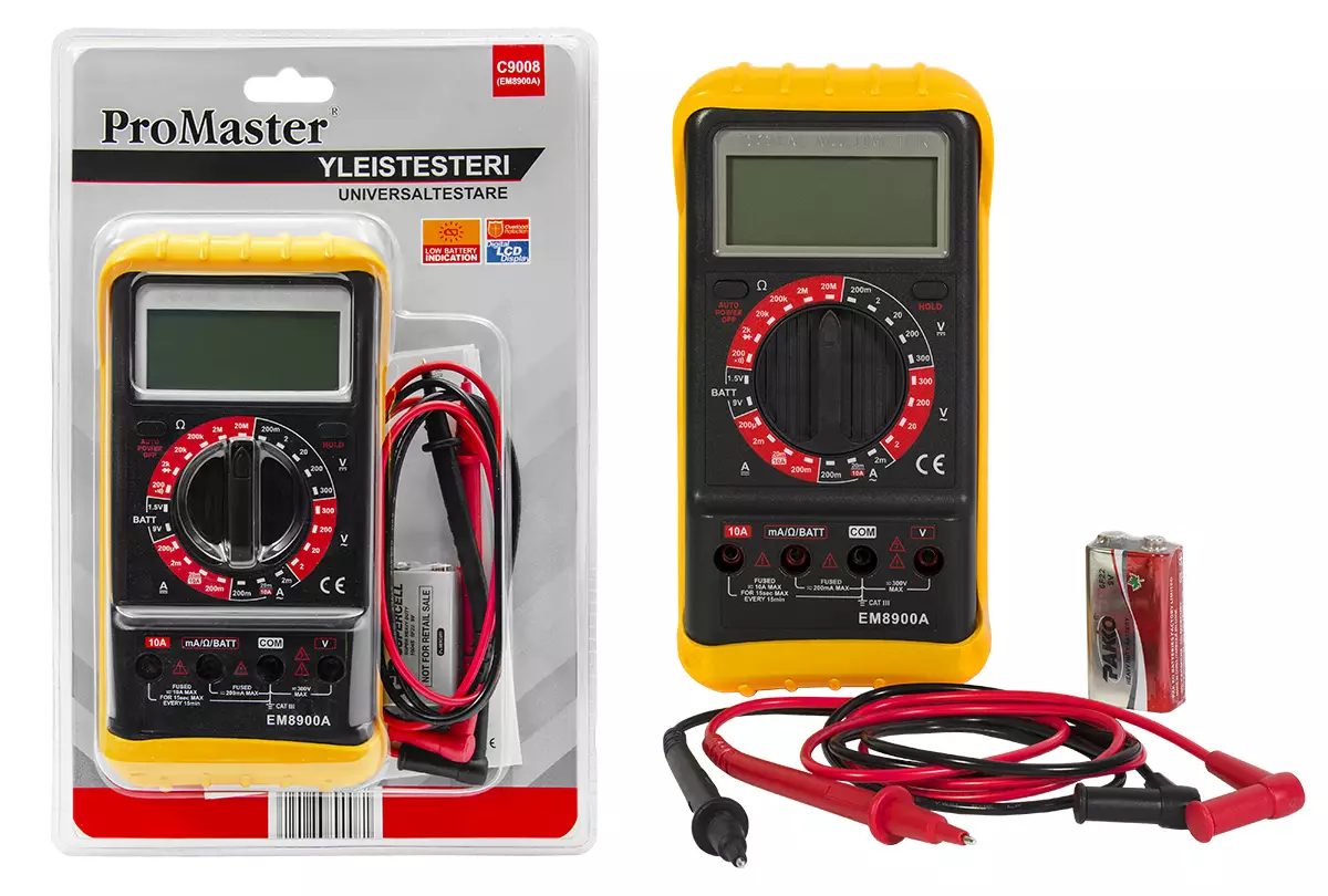 ProMaster - 3½ numeroinen lcd-näyttö - Heikon pariston varoitusilmaisin - Ylikuormitussuojattu - Automaattinen sammutus - Paristo 9v x 1 kpl sisältyy pakkaukseen - Mitat 164 x 85 x 34mm ilman... Lue lisää