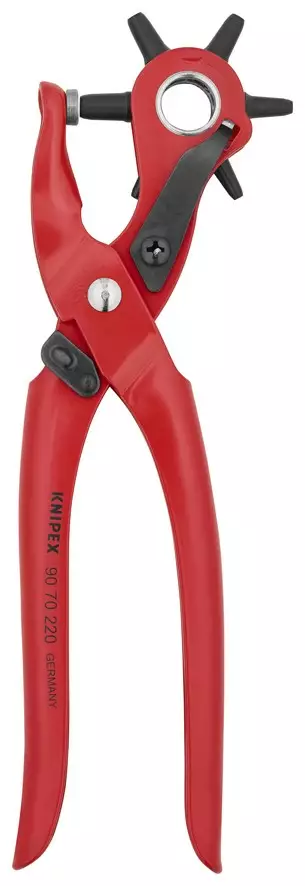 Revolverireikäpihdit punainen jauhepinnoitettu 220 mm - Reikien stanssaamiseen nahkaan, tekstiileihin ja muoviin - Kuusi vaihdettavaa reikämeistiä ø 2,0 / 2,5 / 3,0 / 3,5 / 4,0 / 5,0 mm -... Lue lisää